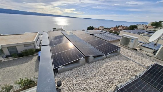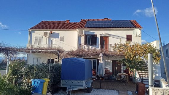 OPIS: Mrežna elektrana za samopotrošnju obiteljske kuće sa apartmanskim smještajem. Instalacija 20 modula od 280Wp na kosom krovu sa crijepom.