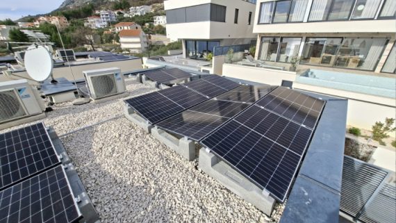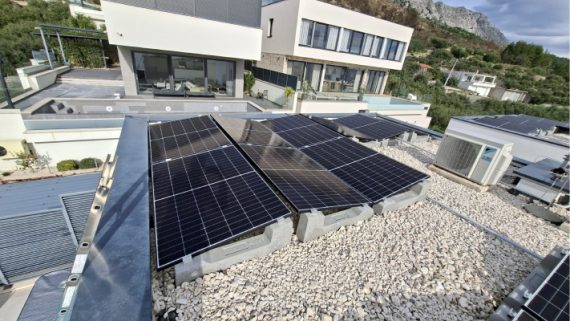 OPIS: Mrežna elektrana za samopotrošnju obiteljske kuće. Instalacija 20 modula od 340Wp na ravnom krovu pomoću Aero-podkonstrukcijskog sustava